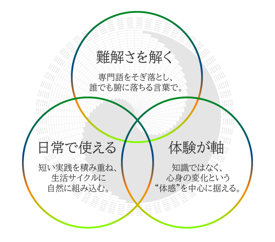 古の学びをそのまま伝えるのではなく、日々の暮らしで使える形に再構築しています。